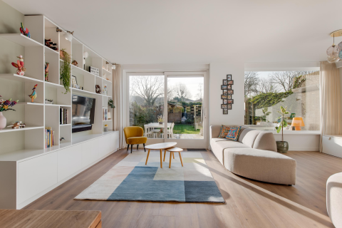 Begane grond: entree, hal, toilet, Z-vormige woonkamer met open haard en schuifpui naar de tuin, brede keuken met inbouwapparatuur, cv-ruimte, bergruimte;